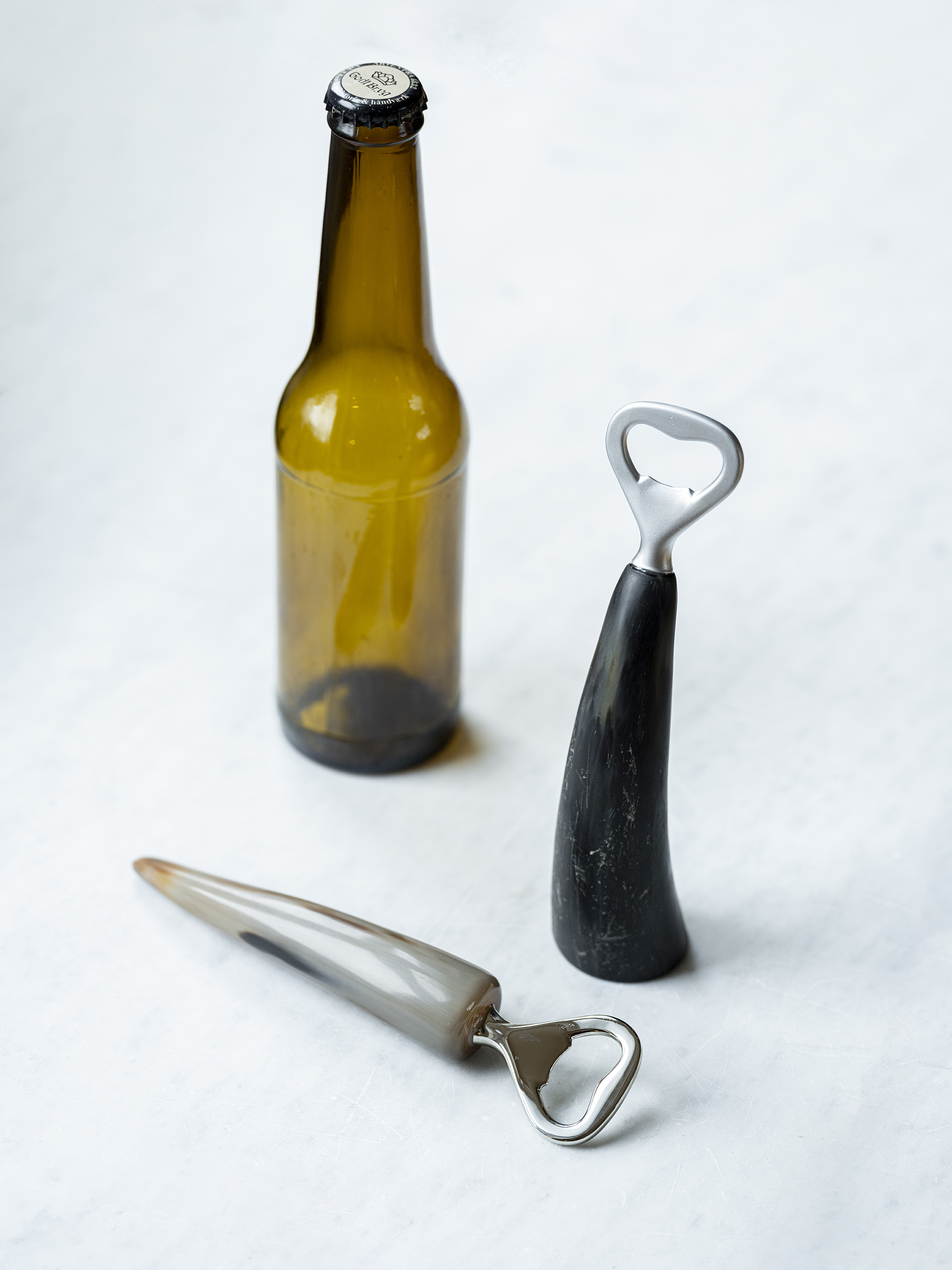 Ich habe den Flaschenöffner aus Horn so gestaltet, dass er sowohl praktisch als auch schön anzusehen ist, wenn er sichtbar aufbewahrt wird. Der polierte Horngriff liegt gut in der Hand und verleiht dem Öffner einen natürlichen, eleganten Ausdruck, der ins Auge fällt, ohne die Funktionalität zu beeinträchtigen.